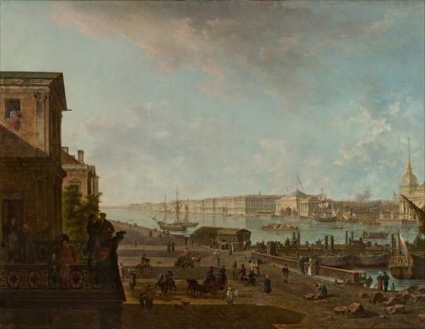 На рубеже XVIII-XIX веков необычайно возрос интерес к прошлому России, что в области пейзажа выразилось в стремлении запечатлеть образы новых и старых городов и различных местностей Российской империи. Создание подобных произведений имело не только художественное, но важное документальное и общественное значение. Адмиралтейство и Дворцовую набережную Алексеев изображал неоднократно. В данном случае вид взят от Первого Кадетского корпуса, располагавшегося на Васильевском острове. На противоположном берегу начиная от Адмиралтейства тянется череда строений Дворцовой набережной. Подобная протяженность композиции соответствует задаче автора – обстоятельно и с документальной точностью отобразить увиденное. Но воспроизводя реальный облик зданий, художник несколько обобщает их формы, окутывая серебристой дымкой, превращая сухой архитектурный чертеж в истинно художественное произведение. Этому способствуют и органично включенные в полотно человеческие фигуры, причем их значительно больше, чем в предыдущих работах.