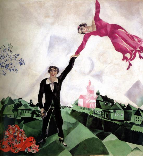 В 1917–1918 годах Шагалом был создан цикл живописных произведений, представляющих автопортрет с молодой женой художника, Беллой. „Прогулка“ принадлежит, несомненно, к наиболее светлым и радостным картинам этого цикла. Мотив полета, возникающий в этом цикле, обретает в „Прогулке“ самое живое, непосредственное воплощение и простое, ясное, быть может, объяснение: влюбленным просто мало земли, и Белла взмывает ввысь, к небу. Полотно вообще пронизано многообразными авторскими метафорами: это и чудесный натюрморт на красной скатерти, напоминающий о брачном пиршестве, и нежная, едва расцветшая ветка на фоне неба, и птичка, зажатая в руке молодого мужчины.