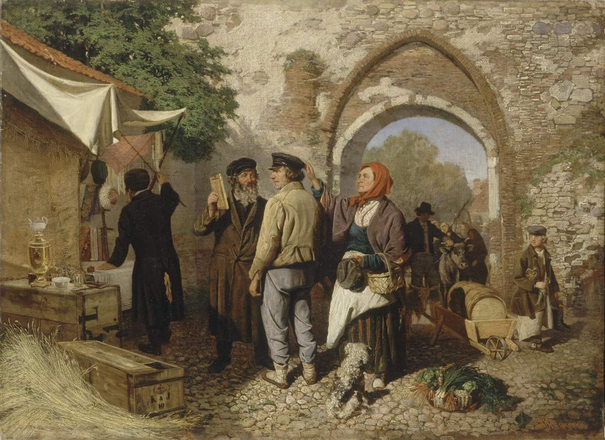 На обороте дублировочного холста воспроизведены академическая печать и надпись: Ученикъ Академiи Карл Петерсонъ, на третномъ экзамен_ 22 Декабря 1862 гъ удостоенъ Советомъ Императорской Академiи художествъ 2-й серебряной медали за ciю картину (genre). Конференцъ-секретарь: Федор… Львовъ Инспекторъ К. Шрейнцеръ