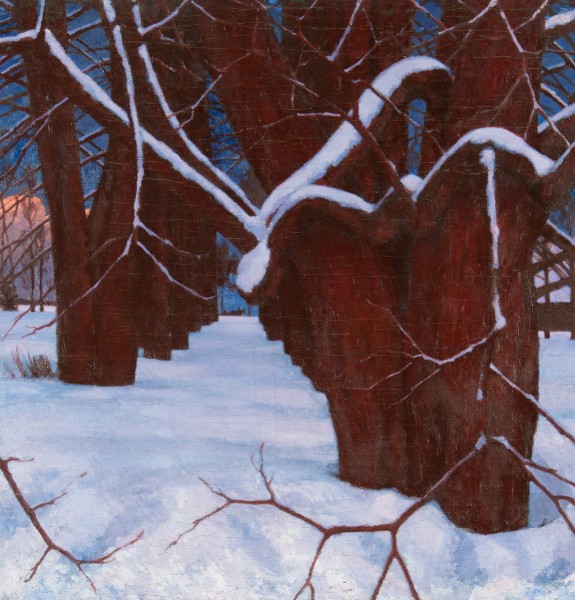 Художник создал эффектную композицию, построенную на ярком цветовом контрасте белого и кармина — снега и стволов старых парковых деревьев на фоне синего зимнего неба. Каталог выставки в Малаге «Времена года. Произведения из собрания Русского музея». 2015. С. 35.