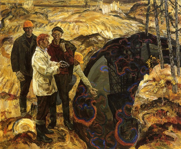 Около семи лет автор работал над воплощением замысла картины «Черное золото». Своего рода сюжетным, колористическим камертоном стал один из эскизов к полотну (находящийся в ГРМ), соответствующий определению самого автора: «В голове сразу же нарисовался холст, построенный на отношениях черного и золотого. Растяжка колористическая получилась богатейшая». Такое решение (вполне реальное по форме) несло в себе живописную метафору и одновременно вполне соответствовало цветовому взаимодействию сверкающей нефти с оранжевыми разводами и цвета природы в осеннем убранстве. Эти живописные качества эмоционально содержательны, выразительны, как и лица рабочих, дождавшихся свежей нефти, которой, по обычаю, можно и умыться. Нефть наряду с людьми — также значимый «персонаж» картины. Ее сверкание на земле и в руках буровика словно подчеркивает радость тех, кто ее добыл. // Анатолий Дмитренко. Большая картина. СПб., 2006. С. 274.