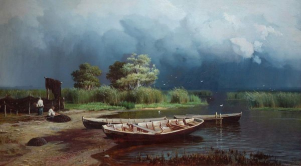 В это же время <во второй половине XIX века> происходит усиление художественного эффекта в тех пейзажах, в которых живописцы смело используют, во-первых, выразительную светотень, а во-вторых — эмоциональную энергетику насыщенной цветовой гаммы («Закат», Юлий Клевер; Ж-7860). Первую группу произведений можно условно причислить к «традиционным» позднеромантическим изображениям природы. Почти монохромным и тяжеловесным кажется затененное пространство в раннем произведении Руфина Судковского «Днепровские лиманы перед грозой» (Ж-10466). В картине «Перед грозой» (Ж-7857), созданной мастером лесного пейзажа Иваном Шишкиным, эффектно выглядят на общем приглушенном фоне большие высветленные участки ландшафта. А одним из самых запоминающихся и обобщающих произведений в этом ряду стало живописное полотно «Притихло» (Ж-4392) Николая Дубовского. Сергей Кривонденченков. Преображенная природа // Преображенная природа. СПб, 2020. С. 9-10.
