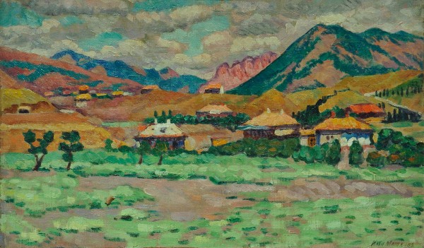 Илья Машков – один из основателей объединения «Бубновый валет». Его пейзажи узнаются по пастозной живописи и многокрасочной колористической сочности. Художник принадлежит к группе мастеров, которую Я. А. Тугендхольд прозвал «московскими сезаннистами». В марте 1916 года Илья Машков и Петр Кончаловский вышли из «Бубнового валета» и перешли в общество «Мир искусства». Однако «Крымский пейзаж» вполне соответствует духу выставок «бубнововалетцев». Примитивизм, в русле которого поначалу развивался «Бубновый валет», активно переосмыслял пейзаж классической изобразительной традиции. В новом методе художник не подражает природе, но исследует ее живописность, опираясь на природные впечатления. В картине цвет будто игнорирует воздушную среду. Объекты выстраиваются в горизонтальной плоскости отдельными пятнами, образующими пространственные планы. Живописная лепка объектов фактурно равнозначна на всей поверхности холста.