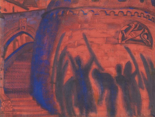 Это типично символистское произведение, в котором о том или ином предмете (в данном случае — о настроениях и переживаниях времени шедшей уже третий год Первой мировой войны) сообщается не прямо, а намеком-образом, системой «соответствий» — мощная круглящаяся стена спящей романской крепости и скользящие по ней тени крадущихся лучников в зловещих отсветах пожарища. Атмосфера произведения переводит размышления о текущей войне в план философских обобщений. Галина Кречина // Николай Рерих. В поисках Шамбалы. СПб, 2020. С. 68.