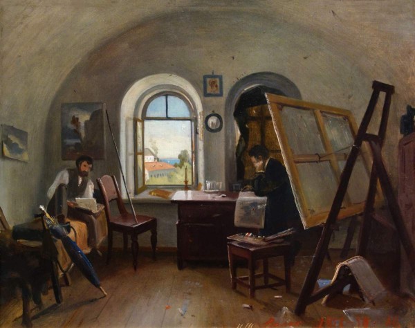Серьезной профессиональной школой для пейзажиста стала этюдная работа на острове Валаам. Суровые ландшафты будто притягивали к себе пейзажистов. Молодые художники, в том числе Шишкин, иногда совершали несколько поездок на остров. Увлеченная атмосфера одного из таких творческих путешествий передана в этюде «И. И. Шишкин и А. В. Гине в мастерской на острове Валааме». Сергей Кривонденченков. Собрание живописи Шишкина в Русском музее // Иван Иванович Шишкин. 1832–1898. Картины, рисунки и акварели, гравюры из фондов Русского музея. СПб, 2020. С. 5.