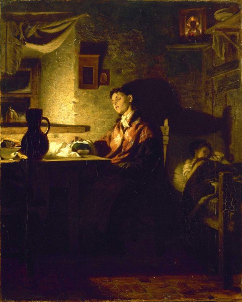 Семейный портрет и «чистый» интерьер в русской живописи обладали своими неповторимыми чертами, но не могли сравниться по глубине психологических обобщений с изображениями человека в камерной обстановке. Так, светлыми надеждами наполнены женские образы в картинах «У окна» (1864) Александра Красносельского, «Мечты о будущем» (1868) Василия Максимова и «Швея» (1875) Михаила Клодта. Важной частью содержания этих картин является композиция с окном, благодаря которой возникает «...безмолвная и вся озаренная солнцем комната – светлое одиночество в минуты отдыха и созерцательной, тихой жизни» *. Но наступал вечер, а с ним загадочное сумеречное освещение и новые «звуки» тишины. В подобные минуты «одиночества» обостряются внутренние переживания, что удалось убедительно передать в произведениях «В комнате» (1862) Ивана Крамского, «Швея» (1870) Иллариона Прянишникова и «Ночью» (1898) Дементия Глущенко. Дополнением к описанию этих художественных образов может служить фрагмент рассказа «День за день» Ивана Бунина: «В комнате тихо. Тихо так, что слышишь, как шипит керосин в горящей лампе <…>; в сердце поднимается какое-то хорошее, но смутное, неопределенное чувство, кажется, что вспоминается что-то далекое и милое, кажется, что сердце со всем примиряется и только просит этого меланхолического сладкого раздумья» **. Кривонденченков С. В. Ностальгия по настоящему // Дом и семья в русском искусстве XIX–XX веков. СПб, 2022. С. 6.