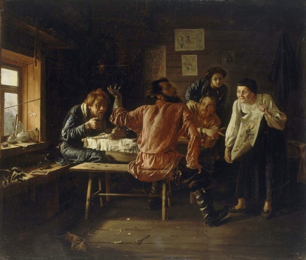 В Академии художеств понимание задач бытового жанра, постепенно оттеснявшего главенствующие ранее исторические темы, сводилось к утверждению бытописательства и легкого морализирования. Тем не менее учившиеся в ней академисты, накапливая опыт правдивого изображения действительности, сумели внести посильную лепту в процесс демократизации искусства. Среди них выделился вышедший из среды потомственных тульских художников А. А. Попов, который отличился уже в 1853 году картиной «Народная сцена на ярмарке в Старой Ладоге» (ГРМ, Ж-1411), отмеченной вниманием рецензентов. Еще больший интерес критики и зрителей вызвала умело и прочувствованно написанная им картина «Демьянова уха» (1856). <...> Более выразительную, экспрессивную по сравнению с Поповым трактовку заданной академистам программы на сюжет басни Крылова «Три мужика» дал в своей одноименной картине 1858 года П. П. Чистяков. Он сосредоточил внимание не на лукавстве одного из мужиков, а на противопоставлении голодного сытым. Сидящий в гротесковой позе хозяин дома, подражающий лубочному изображению генерала на коне, противопоставлен тщедушному крестьянину, уплетающему обед, в то время как другие заинтересованно слушают умствующего краснобая и разглядывают лубок. «Сочинилось очень хорошо и освещение хорошее», – писал молодой художник отцу. Шувалова И. Н. Русское искусство 1860-х годов – вокруг Перова // Святые шестидесятые». Живопись, графика, скульптура. СПб. 2002. С. 14.