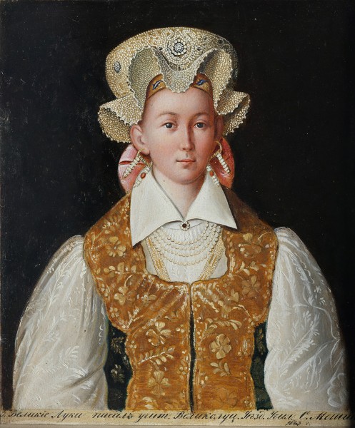 Костюм изображенной — душегрея поверх светлой рубахи, нарядный кокошник — типичный русский народный костюм северных губерний страны, в котором широко использовался мелкий речной жемчуг из северных рек.