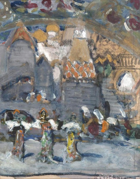 Константин Коровин сформировался как театральный художник в Русской частной опере Саввы Мамонтова в Москве, около двух десятилетий оформляя ее спектакли. Его приход в Императорские театры (1900) положил начало реформированию «казенных» театров: художник становится соавтором режиссеров, композиторов и актеров, средствами живописи формирующим эмоциональную среду спектаклей, тональность сцен. Постановки Коровина составили эпоху в русском театральном искусстве. Особенно вдохновляли его оперы и балеты на сказочные и исторические темы. В эскизе декорации для постановки балета Л. Минкуса «Золотая рыбка» предстает не условная древность, а реальная и в то же время сказочная Русь, отразившаяся в характере ее построек и людей. В этом произведении Коровин дал образец изысканного вкуса и тонкого понимания сцены, музыкальности, зрелищности, продемонстрировав волшебный дар ансамблевого решения и щедрой фантазии. В. Ф. Круглов // «Он победил и время и пространство...». К 225-летию со дня рождения А. С. Пушкина. СПб, 2024. С. 82.