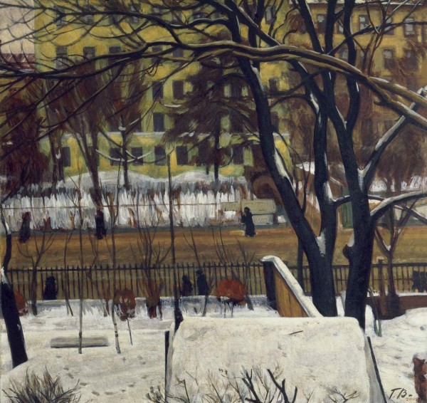 Сквозь темные ветви обнаженных деревьев, чья графическая структура отчетливо читается на фоне рыхлого снега, желтеет большой доходный дом и охристая от слякоти проезжая часть с торопливо проходящими по своим делам горожанами. Лишь снег в палисадниках своей опрятной белизной скрашивает безотрадность типичного городского пейзажа, видимого автором из окна своей комнаты. Галина Кречина // Санкт-Петербург: Портрет города и горожан. СПб, 2003. С. 206.