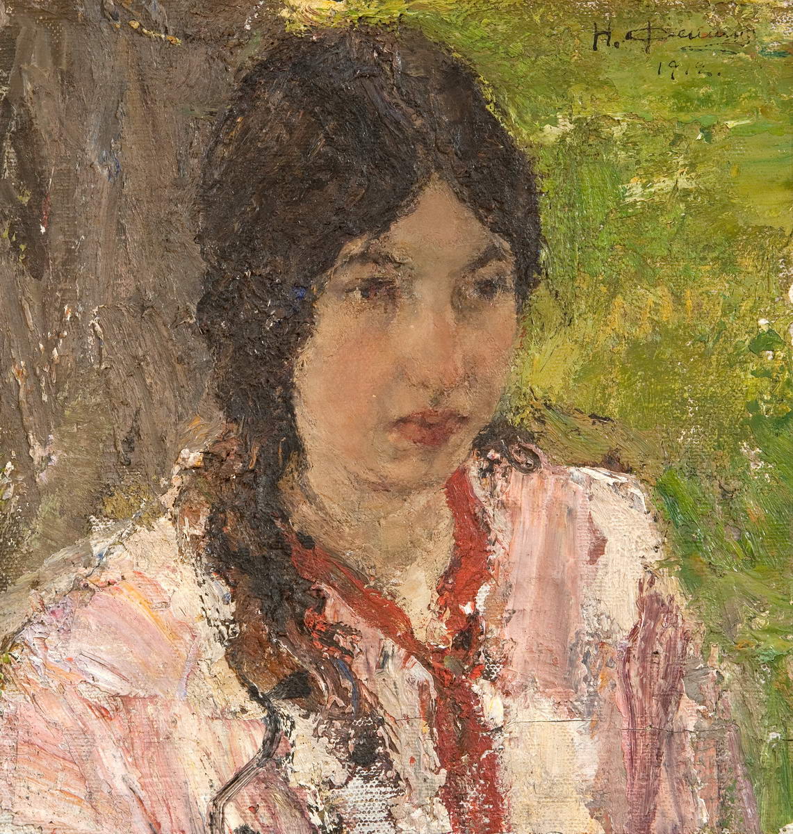 «Однажды в 1910 году (Г. Г. Медведев ошибся. Портрет написан в 1912 году.— Ред.) мои родители,— писал Г. Г. Медведев,— сговорились с ним (Фешиным.— Ред.) поехать вместе на лето в Рязанскую губернию, поселиться там на хуторе, верстах в 40–60 от Рязани. Так и сделали. Здесь Николай Иванович написал портрет моей сестры Маруси» (Николай Иванович Фешин. Документы, письма, воспоминания о художнике. Л., 1975. С. 96).
