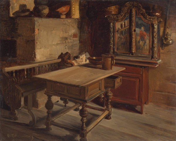 В период утверждения реалистических принципов изображения действительности русские художники также подробно описывали интерьеры крестьянских домов. В избе не было места «изящным мелочам», а каждый бытовой предмет представлял собой жизненно необходимую вещь повседневного обихода. Горшки, кадушки, туеса, сундуки, лавки и многие другие детали убранства избы составляли правдивый рассказ о деревенском доме пореформенной поры в изображениях «внутренних интерьеров» Владимира Маковского, Василия Максимова, Иллариона Прянишникова, Николая Чернова. Таким образом демократическая эстетика открывала в изобразительном искусстве новые темы, связанные с «частной жизнью» человека. Владимир Стасов писал: «…все радости и горе, что растут и живут в избе, в роскошном доме, <…> чем полны дни и ночи, все пошло теперь наружу, в картины…» *. Кривонденченков С. В. Ностальгия по настоящему // Дом и семья в русском искусстве XIX–XX веков. СПб, 2022. С. 6.
