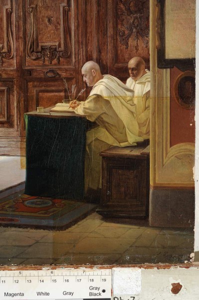 В места утрат красочного слоя подведен реставрационный грунт. Тонировки выполнены масляными красками в пределах утрат по предварительно нанесенному тонкому слою реставрационного лака, после чего картина покрыта защитным слоем даммарного лака.