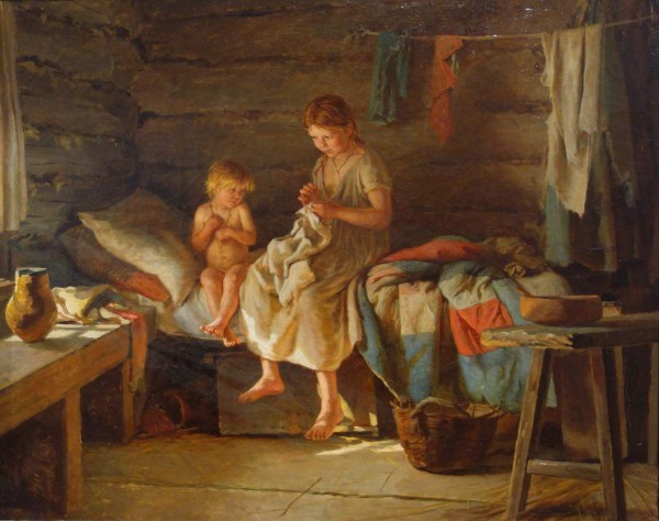 «Женщина и мужчина – два лица одного существа – человека, ребенок же является их общей вечной надеждой»*, – писал в одном из ранних сочинений Андрей Платонов. Любая семья, независимо от благосостояния, может быть счастливой, когда источником этого счастья становятся дети. Для родителей нет большей радости, чем находиться в своем доме рядом с любимым чадом. Наиболее тесной бывает эта связь в первые годы после рождения ребенка. В русской живописи XIX века сохранились необычайно трогательные изображения крестьянских детей.<...> В живописных полотнах «В крестьянской избе» (1889) Ивана Пелевина, «Маленькая няня» (1880) Харитона Платонова, «Сестренка» (1890) и «Лето (С поздравлением)» (1890) Кирилла Лемоха «маленький» человек с интересом рассматривает окружающие его предметы, впервые осознает заботу старшей сестры и открывает мир, начинающийся за пределами родного дома. Кривонденченков С. В. Ностальгия по настоящему // Дом и семья в русском искусстве XIX–XX веков. СПб, 2022. С. 7.