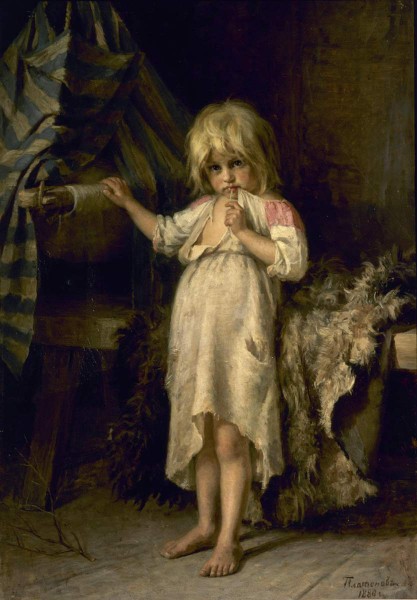 «Женщина и мужчина – два лица одного существа – человека, ребенок же является их общей вечной надеждой»*, – писал в одном из ранних сочинений Андрей Платонов. Любая семья, независимо от благосостояния, может быть счастливой, когда источником этого счастья становятся дети. Для родителей нет большей радости, чем находиться в своем доме рядом с любимым чадом. Наиболее тесной бывает эта связь в первые годы после рождения ребенка. В русской живописи XIX века сохранились необычайно трогательные изображения крестьянских детей.<...> В живописных полотнах «В крестьянской избе» (1889) Ивана Пелевина, «Маленькая няня» (1880) Харитона Платонова, «Сестренка» (1890) и «Лето (С поздравлением)» (1890) Кирилла Лемоха «маленький» человек с интересом рассматривает окружающие его предметы, впервые осознает заботу старшей сестры и открывает мир, начинающийся за пределами родного дома. Кривонденченков С. В. Ностальгия по настоящему // Дом и семья в русском искусстве XIX–XX веков. СПб, 2022. С. 7.