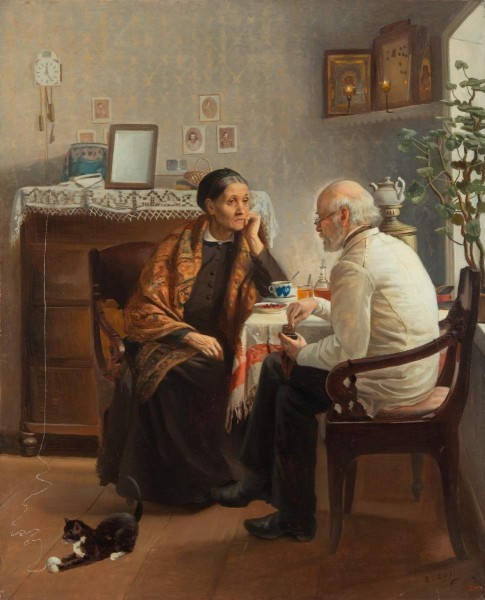 Ощущение гармонии усиливалось в тех изображениях, где уютный уголок комнаты становился местом духовного единения двух близких людей. В картине «Старый друг» (1889) Алексея Наумова молчание пожилых женщины и мужчины воспринимается как благостная награда за верность и преданность друг другу на протяжении многих лет. В такие редкие моменты жизни рождается «задумчивое счастье»*. Кривонденченков С. В. Ностальгия по настоящему // Дом и семья в русском искусстве XIX–XX веков. СПб, 2022. С. 6.