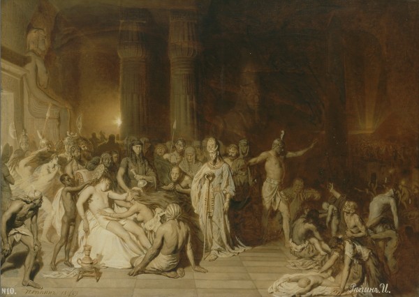 Академические эскизы и картины Репина в собрании Русского музея позволяют выявить противоречивые и самобытные черты начального этапа становления художника как исторического живописца. Эскиз «Избиение первенцев египетских» является вариантом первой академической программы художника. За удачно скомпонованную многофигурную композицию, близкую к традиционным классицистическим построениям живописного пространства, Репин получил от Академии художеств первую премию (100 рублей). Работа почти полностью (возможно, лишь за исключением асимметричного источника света в левой части изображения) отвечала академическим требованиям создания «общего» в картине.
