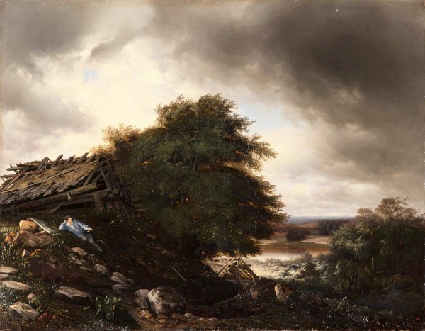 Художники середины XIX века, определившие позднеромантическую линию в отечественной пейзажной живописи, восхищались изменениями «неказистой» русской природы в преддверии дождя или грозы. В картине «Вид в имении графа Кушелева-Безбородко „Краснопольцы“ Холмского уезда Псковской губернии» Аполлинария Горавского изображение надвигающихся темных туч кардинально меняет облик спокойного сельского уголка с фигурой отдыхающего художника. Сергей Кривонденченков. Преображенная природа // Преображенная природа. СПб, 2020. С. 8.
