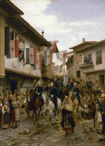 Серия картин на сюжеты из Русско-турецкой войны 1877–1878 годов была написана Дмитриевым-Оренбургским по заказу императора Александра II. Художник не был участником войны, поэтому для создания полотен ему пришлось изучать документы, общаться с участниками битв, выезжать в Болгарию на места боев. Изображен въезд главнокомандующего великого князя Николая Николаевича в освобожденную от турок древнюю столицу Болгарии. Страна побед. СПб, 2025. С. 110. / Картины военной жизни в отечественном искусстве XVI–XX веков. СПб, 2022. С. 118.