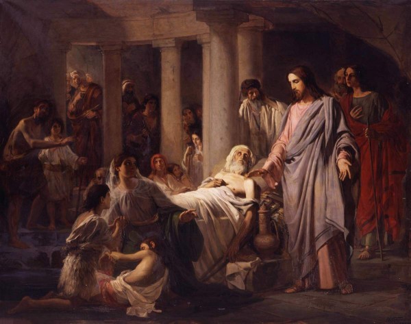„Есть же в Иерусалиме у Овечьих ворот купальня, называемая по-Еврейски Вифезда, при которой было пять крытых ходов; / В них лежало великое множество больных, слепых, хромых, иссохших, ожидающих движения воды; / Ибо Ангел Господень по временам сходил в купальню и возмущал воду, и кто первый входил в нее по возмущении воды, тот выздоравливал, какою бы ни был одержим болезнью. Тут был человек, находившийся в болезни тридцать восемь лет. Иисус, увидев его лежащего и узнав, что он лежит уже долгое время, говорит ему: хочешь ли быть здоров? Больной отвечал Ему: так, Господи; но не имею человека, который опустил бы меня в купальню, когда возмутится вода; когда же я прихожу, другой уже сходит прежде меня. Иисус говорит ему: встань, возьми постель твою и ходи. И он тотчас выздоровел, и взял постель свою, и пошел“.Ин. 5, 2–9. Иисус Христос. СПб, 2000. С. 143.