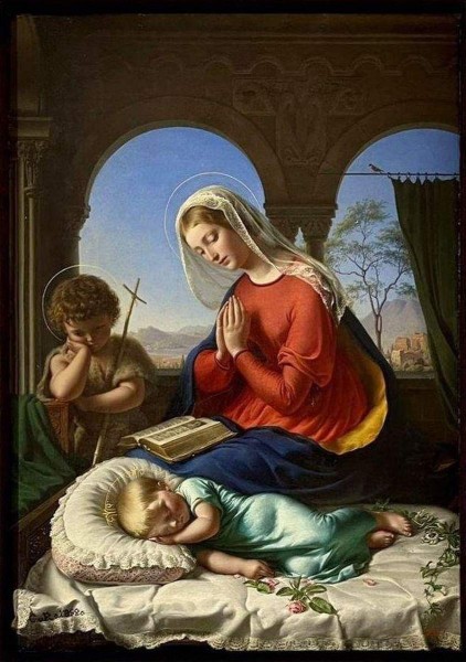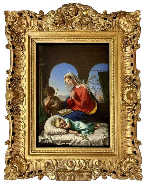 В одном из писем поэт В. А. Жуковский писал Е. А. Рейтерну: „Мне мечтается, что ты напишешь для Государыни Мадонну. Но не подражай, а следуй собственной мысли“. Однако художник не мог не обратиться к искусству эпохи раннего Возрождения. Увлечение живописью старых мастеров прослеживается в италинизирующих образах Мадонны и маленького Иоанна Крестителя, в цветовой гамме, в тщательной прорисовке деталей, а также пейзажа на фоне арочных проемов. В то же время в этом произведении отчетливо ощутимо и влияние „назарейцев“. Мадонна, написанная по заказу Александры Федоровны, находилась в Александрии в Петергофе. Раиса Дашкина // Иисус Христос. СПб, 2000. С. 91.