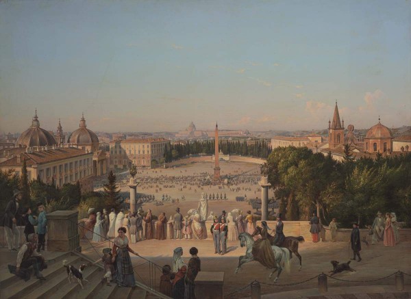 Иванов изобразил площадь со стороны высокой террасы на холме Пинчио. Художник выступает здесь как прекрасный мастер многофигурной композиции. В левой части площади видны купола схожих по своему облику церквей Санта-Мария-деи-Мираколи (1681) и Санта-Мария-ин-Монтесанто (1679), справа – купол церкви Санта-Мария дель Пополо, вдали виднеется Ватикан с куполом собора Святого Петра.