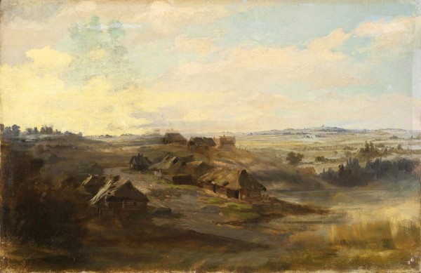Пейзаж с избами и прудом в окрестностях Петербурга