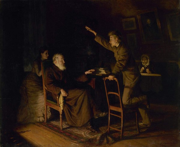 Художник выбрал сюжет, отражающий горячие споры „детей" с „отцами". В повествовательной форме жанровой картины он рассказывает о столкновении юноши-студента, полного романтических представлений, и скептически настроенного отца, упорно отстаивающего „старое". Построенная по диагонали композиция и освещение центральной группы отсветом горящего камина усиливают выразительность сцены. Жадно ловит каждое слово молодая девушка -сестра студента, в то время как старушка-мать безучастно сидит за пасьянсом. Разные поколения разделяют здесь противоположные убеждения — такова суть типичного для того времени семейного конфликта и смысл содержания картины. Ирина Шувалова // Санкт-Петербург: Портрет города и горожан. СПб, 2003. С. 243.