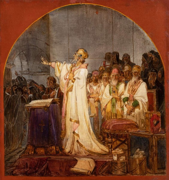 В числе поступивших в Русский музей в 1930 году из Академии художеств работ Сурикова – четыре эскиза росписей храма Христа Спасителя в Москве (Ж-4253, Ж-4254, Ж-4255, Ж-4256). Этот принятый художником по окончании Академии официальный заказ – изобразить четыре Вселенских Собора – казалось бы, был чужд его независимой натуре. Однако, проявляя большой интерес к раннему периоду христианства с его подвижниками и мучениками, Суриков стремился в лицах, позах, продуманных жестах императоров и церковных деятелей показать убежденность, внутреннюю силу, даже фанатизм. Художник искал в них черты, которые бы роднили их с евангельскими пророками и проповедниками. Важны и высокие живописные качества этих эскизов, еще не подвергшихся исправлениям чиновничьей Комиссии по построению храма, после которых заново написанные согласно сделанным поправкам картоны утратили свежесть и оригинальность первоначальных творческих решений. И тем не менее не только эскизы, свидетельствующие о развивающемся живописном таланте Сурикова, но и сами росписи обогатили его опытом работы над большими многофигурными композициями, подготовив почву для самостоятельного творчества. И. Шувалова. Работы Сурикова в Русском музее // Суриков в Русском музее. СПб, 1998. С. 65.