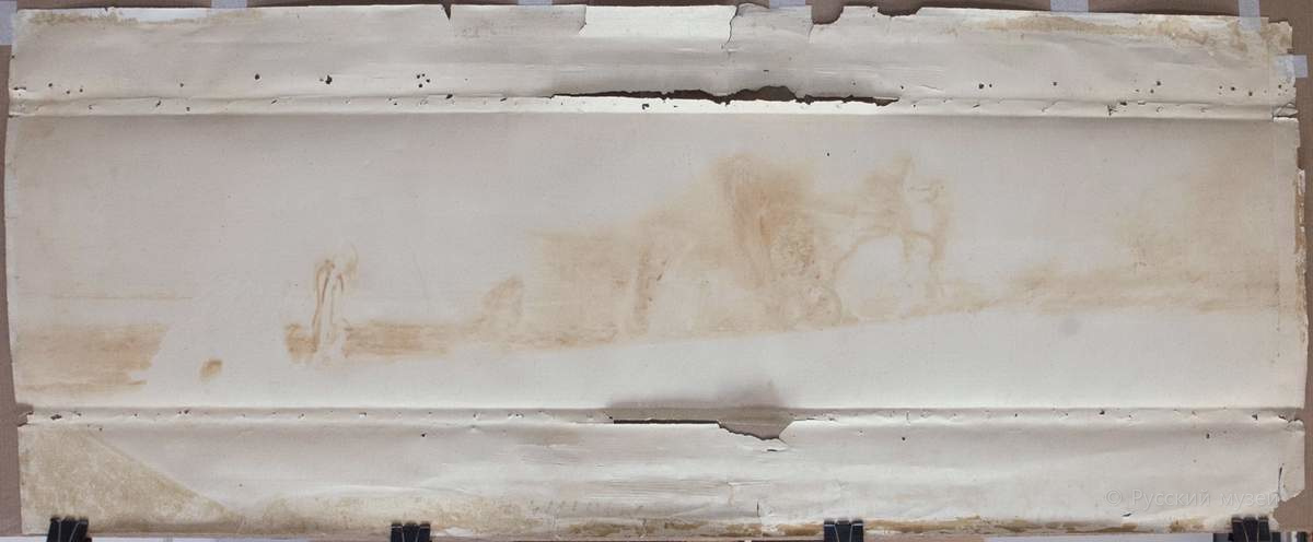 Решением реставрационной комиссии была утверждена необходимость разогнуть загнутые на тыльную сторону верхний и нижний края основы с фоновым изображением.