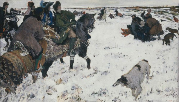 Петр, с молодости увлеченный переустройством страны, в отличие от своего отца Алексея Михайловича воспринимал охоту как пустую забаву. И. И. Голиков в «Деяниях Петра Великого» сообщает, как однажды юный царь посмеялся над боярами, пригласившими его на охоту. Он объявил на поле, что хочет иметь дело с господами, а не с их холопами-псарями. Псари были отпущены. Бояре не смогли совладать с собаками, напугавшими лошадей, которые унесли седоков прочь или вывалили всадников из седел. Этот момент и изобразил В. А. Серов. В центре внимания художника оказались взаимоотношения двух поколений русских людей — старой боярской аристократии, остающейся в «прошлом», и новых деятелей, подчас безродных, но жизненно активных, уверовавших в Петра и европейское будущее России. В этой композиции, отмеченной красотой пластического решения и острыми контрастами формы, Серов мастерски воссоздал колорит старой охоты на Руси, опоэтизировав бескрайние заснеженные пространства под бледным, северным небом. Владимир Круглов // Электронный каталог «Герои и злодеи русской истории». СПб, 2010. С. 160.