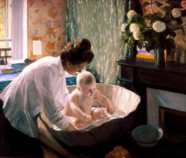 Удостоенный за эту [«Базар в деревне»] картину пенсионерства в Париже, Кустодиев некоторое время работает там в мастерской Р. Менара, посещает Лувр и выставки современного искусства, восторженно пишет в Россию об увиденных картинах. <...> Написанная в «столице мира» картина «Утро», изображающая его молодую жену за купанием недавно родившегося сына-первенца, свидетельствует о произошедших изменениях в живописи художника. Импрессионистическая по концепции, она выдержана в чистых светлых красках, полна поэзии и ощущения тепла семейного уюта. Этим холстом автор положил начало череды произведений – портретов и жанров, посвященных своей семье. Круглов В.Ф. Кустодиев: между лирикой и гиперболой // Борис Михайлович Кустодиев. К 125-летию со дня рождения. СПб, 2003. С. 11.