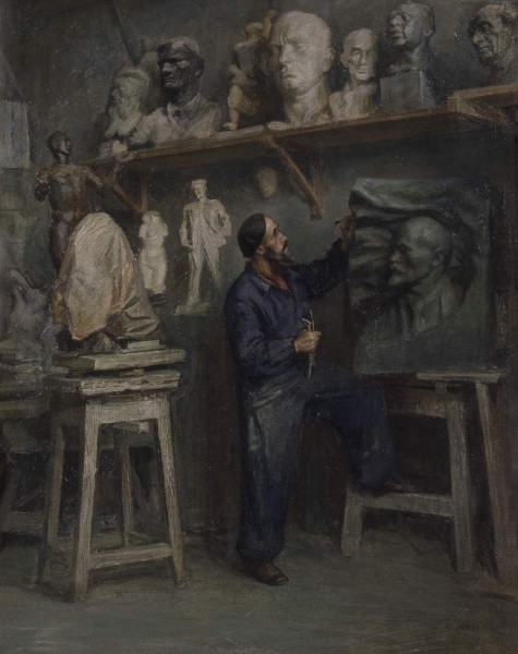 Главное действующее лицо этой жанровой сцены — известный советский скульптор И. М. Чайков, работающий над горельефом В. И. Ленина. В то же время Рянгина показывает, что диапазон тем и героев, к которым обращается Чайков, выходит за рамки официоза. Здесь же в мастерской находятся скульптурные портреты известных деятелей культуры, среди которых художник С. В. Герасимов, сотрудник Чайкова по преподаванию во ВХУТЕИН, и поэт Л. М. Квитко — член бывшего Еврейского антифашистского комитета, расстрелянный через несколько лет после создания этого полотна. Но центральное место, безусловно, занимает портрет В. В. Маяковского, «первосоздателем» образа которого в скульптуре стал именно Чайков, много лет работавший над проектом монументального памятника поэту. Елена Козлова // Электронный каталог «Герои и злодеи русской истории». СПб, 2010. С. 451.