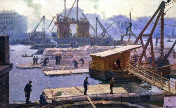Ремонтные работы на одном из многочисленных ленинградских мостов, штабеля досок, подъемные краны и другая строительная техника, заполняющая набережную, привлекли внимание художника как характерный эпизод будничной жизни города. Анна Антонова // Санкт-Петербург: Портрет города и горожан. СПб, 2003. С. 315.