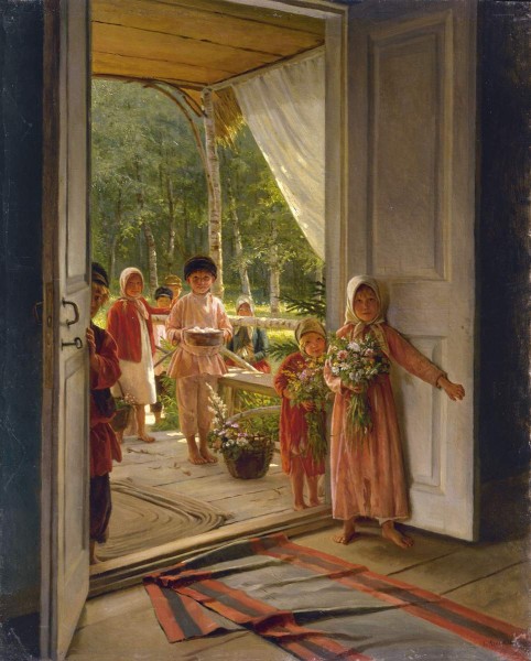 «Женщина и мужчина – два лица одного существа – человека, ребенок же является их общей вечной надеждой»*, – писал в одном из ранних сочинений Андрей Платонов. Любая семья, независимо от благосостояния, может быть счастливой, когда источником этого счастья становятся дети. Для родителей нет большей радости, чем находиться в своем доме рядом с любимым чадом. Наиболее тесной бывает эта связь в первые годы после рождения ребенка. В русской живописи XIX века сохранились необычайно трогательные изображения крестьянских детей.<...> В живописных полотнах «В крестьянской избе» (1889) Ивана Пелевина, «Маленькая няня» (1880) Харитона Платонова, «Сестренка» (1890) и «Лето (С поздравлением)» (1890) Кирилла Лемоха «маленький» человек с интересом рассматривает окружающие его предметы, впервые осознает заботу старшей сестры и открывает мир, начинающийся за пределами родного дома. Кривонденченков С. В. Ностальгия по настоящему // Дом и семья в русском искусстве XIX–XX веков. СПб, 2022. С. 7.