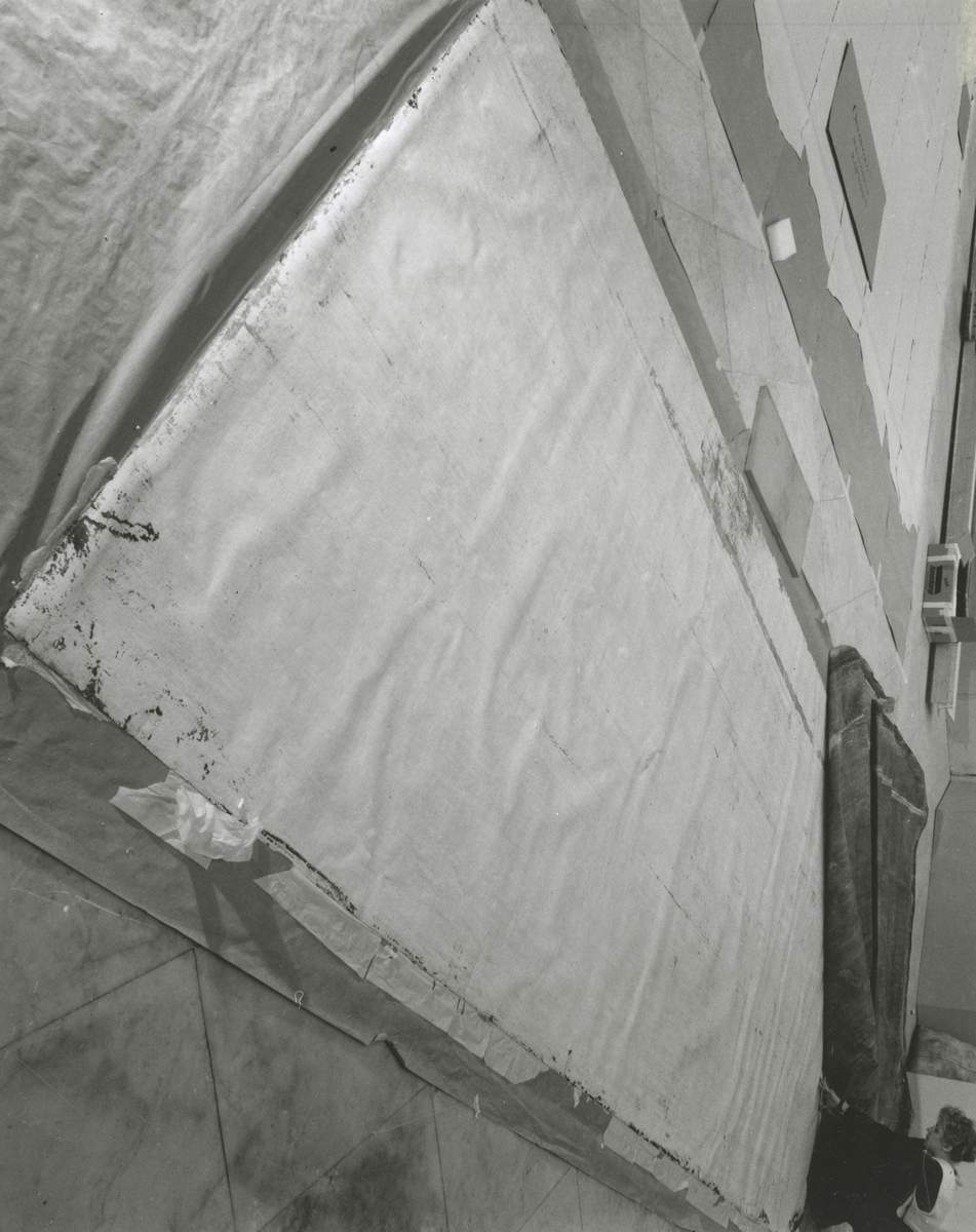 Основными и сложными задачами были проведение операции по удалению переводного холста и осуществление повторного перевода картины на новый холст. Процесс такой реставрации после полного удаления старого холста предполагает необходимость переворачивать картину, не имеющую основы. Эту операцию можно считать уникальной, учитывая размер картины 2,5 х 5 метров. После предохранения красочного слоя с помощью прочной профилактической заклейки, картина на щите была перевернута лицевой стороной вниз и старый переводной холст был удален. Повторное укрепление и прессование лицевой стороны позволило полностью устранить деформацию красочного слоя с грунтом и укрепить отставание краски в местах расслоений. После проведения всех предварительных мероприятий по укреплению и выравниванию красочного слоя и подготовке тыльной стороны, была осуществлена сложная операция подведения новой основы из льняного холста. Картина была натянута на новый подрамник и вновь получила возможность экспонироваться на выставках и в залах музея.