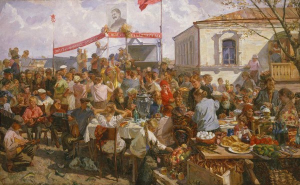 Arkady Plastov’s Collective Farm Holiday depicts the harvest celebrations at a Soviet collective farm. The festivities are not among those introduced by the Communist authorities; this is one of the traditional Russian folk holidays marking the most important events in the annual cycle of life. The villagers have brought in the harvest; now it is time to reap the fruits of their labours. Nature has been kind and lavishly rewarded their efforts. The banner crowned by the portrait of Joseph Stalin claims that «life has become better, life has become fun.» This is a token of the Soviet period and Communist propaganda, transferring the traditional folk festival beyond the bounds of a concrete village into a national celebration.