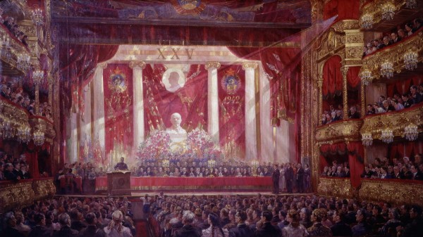 Среди них (в президиуме): С. М. Буденный, К. Е. Ворошилов, М. И. Калинин, А. Н. Косыгин, Н. Г. Кузнецов, И. Д. Папанин, И. В. Сталин, Н. С. Хрущев. Написанное в годы Второй Мировой войны, это полотно приобрело особое значение. Торжествующие красные тона помогли внушить уверенность в том, что страна выйдет из войны победителем.
