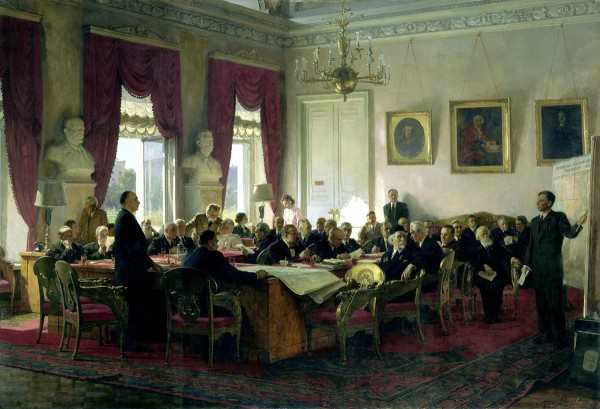 The mural was created by a group of artists led by Vasily Efanov. Efanov enlisted the group, which painted around two hundred studies in all for the canvas. Many of the composition’s individual portrait studies of academicians became significant works in their own right. They were exhibited alongside the larger painting at the All-Union Art Exhibition in Moscow in 1952. The canvas depicts a session of the Presidium of the USSR Academy of Sciences discussing construction plans for the Main Turkmen Canal. The photographic authenticity with which the work documents the event doesn’t detract from its virtues as a formal group portrait painted in the best traditions of the realistic school. The artists’ collective was awarded a 3rd-degree Stalin Prize for the main canvas and individual portraits.