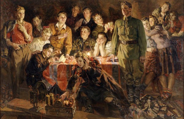 Соколов-Скаля воссоздает героев своего полотна по этой книге и руководствуясь собственной художнической интуицией. В центре молодежной группы он помещает фигуру старого большевика Проценко, на первом плане у рации сидит Любовь Шевцова, правее, во весь рост изображен Иван Туркенич в военной форме, за столом слева записывающий передачу Олег Кошевой, за ним стоят Иван Земнухов и Сергей Тюленин, а правее сидит Ульяна Громова. Художнику удается передать экспрессивные психологические оттенки каждого из своих персонажей, но в целом все они подчинены единой идее.