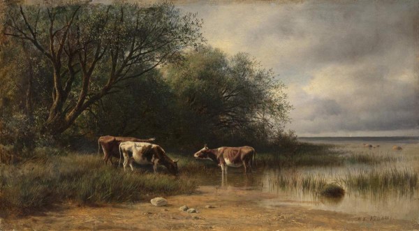 Одним из самых характерных изображений русской деревенской природы является картина «Стадо у реки в полдень». Безупречное знание крестьянской жизни помогло барону Клодту создать достоверный образ среднерусского пейзажа, включающего равнину, перелески, извилистое русло обмелевшей в летнее время реки, стадо коров, спасающихся от зноя в тенистой прохладе деревьев и на водопое. Казалось бы, необходимые «законченность» и совершенство в воплощении выбранного мотива достигнуты. Но живописец не остановился на этом. «Теперь я много работаю, – писал он весной 1870 года Павлу Третьякову, – и думаю к выставке приготовить несколько картин, особенно же занимаюсь в настоящее время изучением животных»*.