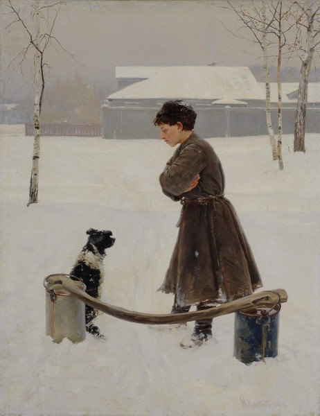 Неспешно беседует с лохматым другом, сложив руки на груди, и мальчик на полотне Николая Касаткина («Мальчик с собакой», 1890-е). Он остановился на зимней дороге, поставив на снег тяжелую ношу: коромысло с полными ведрами воды. Пес печально смотрит вдаль, грустно наклонена вниз голова юноши. Холод, невеселые картины будущего объединяют этих уставших путников. И в то же время их глубокое дружеское взаимопонимание, их обращенные друг к другу фигуры рождают ощущение теплого диалога на фоне серого морозного пейзажа. Анастасия Карлова. Верные друзья детства // Жизнь замечательных собак. СПб. 2025. С. 92