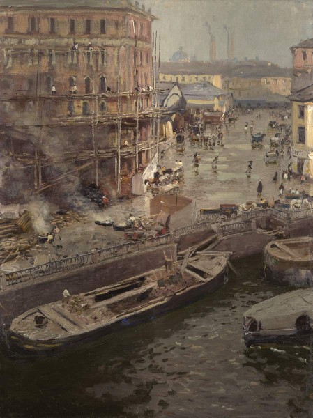 „На Екатерининском канале летом" – вторая из двух тематических и композиционно схожих натурных работ мастера из коллекции Русского музея. На этот раз художник предпочел холодную синеватую колористическую гамму, созвучную слегка сумеречному состоянию природы. Мокрая, в лужах, улица, торопящийся по свои делам городской люд, тот же дом напротив, те же барки. Художник мастеровито и бесстрастно зафиксировал то, что видел – картину жизни большого города. Галина Кречина  // Санкт-Петербург: Портрет города и горожан. СПб, 2003. С. 93.