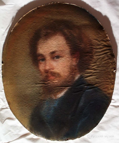 Автопортрет поступил в реставрацию в связи с прогрессирующим процессом отделения тонкого листа бумажной основы от низкокачественного картона. На участках раздублирования наблюдались значительные деформации бумаги, угрожающие стиранием красочного слоя пастели, жесткие изломы в местах наибольшего скопления дублировочного клея. По всей поверхности имелись значительные потертости красочного слоя.