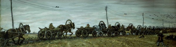 Если для художников авангарда 1910-е годы были временем „бури и натиска“, то для их сверстника Герасимова, в будущем классика советской живописи, это был период поисков своего места на пути традиций. Его, молодого человека из провинции, волновал пафос искусства передвижников, ему по-прежнему казались актуальными их темы. Вместе с тем бывшему ученику Архипова и Коровина нравился умеренный импрессионизм мастеров Союза русских художников. Чаще всего он писал то, что хорошо знал и любил — родную Тамбовщину с ее маленькими городками и бескрайними степными дорогами. В предреволюционные годы важную роль в интерпретации Герасимовым мотивов русской провинции играли изображения лошадей. В фризообразном полотне „Обоз порожняком“ изображен монотонный и мощный поток подвод, при свете первой звезды возвращающихся в деревню. Молодой художник дал новую жизнь мотиву, некогда взятому в основу классических картин