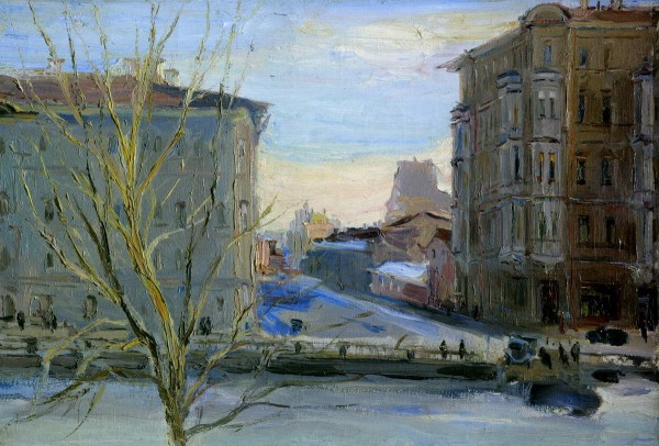 Трудно сказать, когда, в какой момент, но Пакулин понял, что он может рассказать все о войне и блокаде именно в пейзаже. В самую суровую ленинградскую зиму 1941–1942 годов художник начал работу над серией пейзажей. За два с половиной года он создал их несколько десятков. «Блокадную серию Пакулин создавал, не задумывая ее заранее. Само собой, в ходе творческой работы получилось, что все этюды сцеплены единым эмоциональным звучанием, которое связывает их в один непрерывный ряд. Он стремился к подлинности ощущений, поэтому, невзирая на холод, обстрел, голод, он работал на улице»*. <…> Теперь сосредоточенно всматривался художник в меняющийся облик города, стараясь не пропустить мгновения, уходящие в вечность. В ситуации близости смерти ему по-настоящему открывалась величественная красота Ленинграда, она вселяла надежду. Пакулин был одним из тех, кто смог это почувствовать и выразить в своих пейзажах. Ольга Мусакова. Вячеслав Пакулин. В поисках стиля эпохи // Вячеслав Пакулин. В поисках стиля эпохи. СПб. 2021. С. 12.