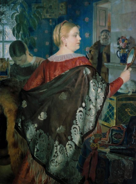Кустодиев, с начала века известный тонкими психологическими портретами, в середине 1910–1920-х годах создал ряд портретов-панно, сложно сочетающих индивидуальное и типизированное, иронию и откровенное любование персонажами. Большей частью это были купчихи. Дородные, румяные, плавные в движении, горделивые, они воплотили народный идеал красоты и здоровья. Их средой был мир русской провинции со свойственной ей смесью старого и нового в быту, одежде, с любовью к ярким и звучным краскам, безудержному веселью, шумным ярмаркам, гуляниям на масленице. Эта жизнь, цельная и самодостаточная, при всей ее ограниченности, увидена и воспроизведена пытливыми глазами чуть насмешливого и остроумного рассказчика. Трудно представить, что душевно и колористически щедрое, светоносное искусство Кустодиева сохранило свои удивительные качества даже в ту пору, когда болезнь лишила его возможности двигаться. Как справедливо отметили исследователи, а прежде всего сам художник, у него была "чудесная страна воспоминаний". Это произведение — замечательный и характерный пример грезы-видения о сочных пышных красавицах, лазоревых вечерах.