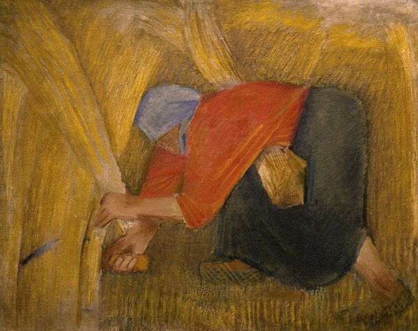 <В собрании Русского музея> представлены наиболее значительные живописные произведения Пахомова, созданные в самое активное десятилетие — 1920–1930-е годы, сохраняющие основные пластические характеристики изобразительной манеры художника, — «Сенокос» (1924), «Жница» (1928), «Портрет работницы (Девушка в синем)» (1927), «Стрелки из лука» (1929–1930), «Портрет девушки в голубом» (1929), «Спор во ржи» (1929), «У Петропавловской крепости» (1934). Укрепление плоскости, тяготение к монументальности, сдвиги и развороты фигур, игра фактур и света, ясность силуэта, звучность локального цвета и предпочтение пятна линии, уравновешенность композиции становятся главными выразительными инструментами мастера. Не случайно такие знаменитые холсты как «Портрет работницы» и «Жница» наиболее отчетливо воплощают вектор живописных поисков Пахомова в эти годы. Н. М. Козырева. Пахомов. Живопись и графика первой половины ХХ века // Алексей Федорович Пахомов. К 125-летию со дня рождения. СПб, 2025. C. 7.