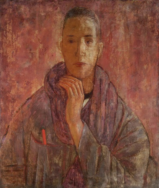 В 1926–1927 годах Самохвалов принимал участие в восстановлении Георгиевского собора в Старой Ладоге – уникального памятника живописи и архитектуры XII века. Увлечение фресками Древней Руси повлияло на большинство его работ тех лет. Очевидно оно и в автопортрете, написанном темперой, имитирующей матовую фактуру фрески. Замкнутый, нерасчлененный силуэт, словно отгораживающийся жест руки говорят об отстраненности, сосредоточенности мысли и воли художника внутри себя. Черты лица едва намечены легкими касаниями кисти. Портретное сходство важно здесь лишь настолько, насколько в нем проявляется момент завороженного предстояния художника перед миром. Из деталей выделен лишь красный карандаш – рабочий инструмент, с помощью которого вдохновение выльется на холст или лист бумаги. (Л. Б.).