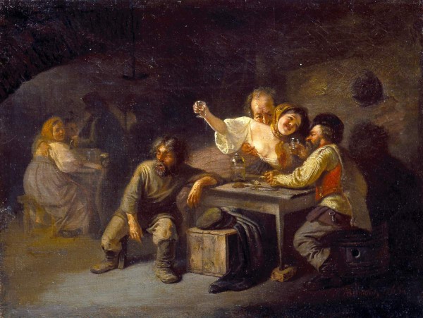 В целом ряде шестидесятнических полотен запечатлены эпизоды городской повседневности, отражающие приметы целой эпохи. Это и продрогшие «Дети-нищие» Ф. С. Журавлева, просящие подаяние у угрюмого бедняка-чиновника, бегущего через замерзшую петербургскую реку, это и шумный «Сенной рынок в Петербурге» А. М. Волкова (Ж-2636) с окруженным зеваками накренившимся городским дилижансом, из которого спешат выскочить люди, и его же картина «В таверне» (Ж-9216), где веселящиеся мужики и подвыпившая разбитная женщина представлены среди убогой обстановки кабака: на пустой столешнице – штоф водки, табуретом служат ящики. Герои картины бесхитростны, искренни, но их примитивные нравы грубы. Здесь нет места красоте и гармонии. Шувалова И. Н. Русское искусство 1860-х годов – вокруг Перова // Святые шестидесятые». Живопись, графика, скульптура. СПб. 2002. С. 17.